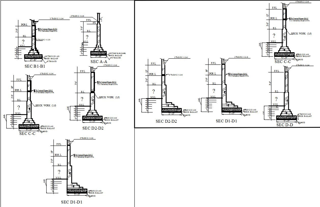 Different sections of footing design of the house in AutoCAD 2D drawing, CAD file. Sections A-A, B1-B1, C-C, D-D, D1-D1, and D2-D2 of the footing are given with dimensions and other details. For more detailed information download the 2D AutoCAD dwg file.