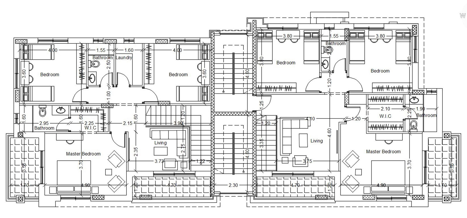 Floor layout plan of flats with details in AutoCAD 2D drawing. In this file, bedrooms, the master bedroom with attached toilet-bathroom, kitchen, living room, laundry, balconies, etc. are given with dimension details. Furniture details are also given in this plan. For more detailed information download the 2D AutoCAD dwg file.