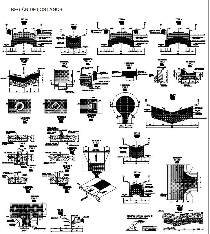 Lake region structure section blocks design in AutoCAD 2D drawing, CAD file. In this drawing, different sections of the design of the structure are given with dimension details. For more detailed information download the 2D AutoCAD dwg file.
