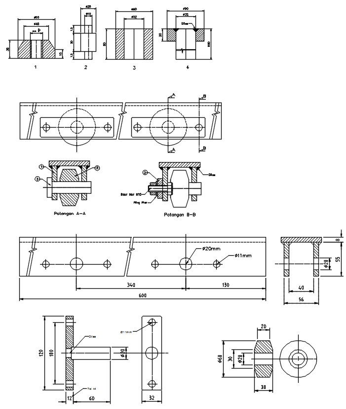 Feeder pusher components of the incinerator plant in AutoCAD 2D drawing, CAD file. Cross sections A-A and B-B are given with details in this file. For more detailed information download the 2D AutoCAD dwg file.