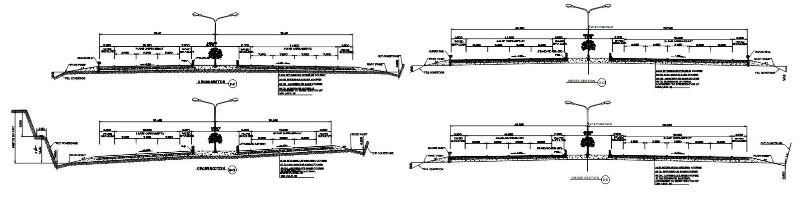 Different cross sections of a bypass road in AutoCAD 2D drawing, CAD file. 3-lane carriageway, 4-lane carriageway, 6-lane carriageway, and other details are given in this file. For more detailed information download the 2D AutoCAD dwg file.