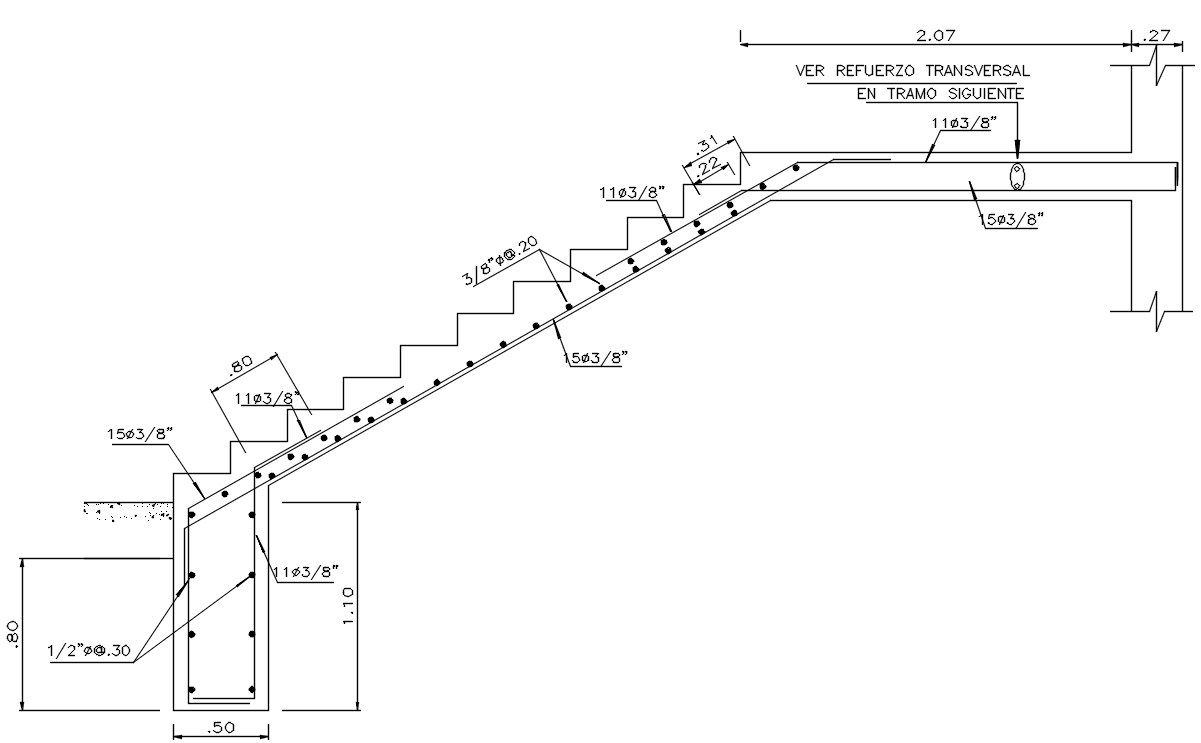 Stair design with reinforcement details in AutoCAD 2D drawing, CAD file. landing beam width is 2.07 given. For more knowledge and detailed information download the 2D AutoCAD dwg file.