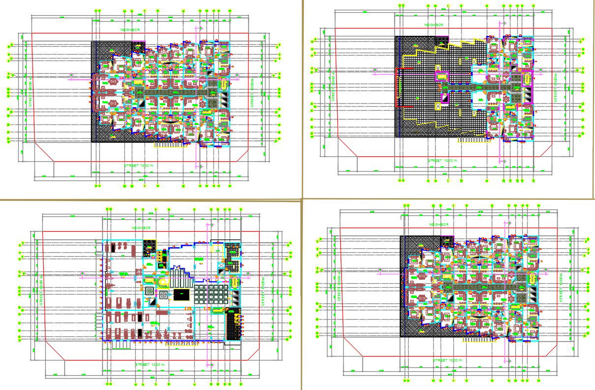 2D design of different floor furniture plans in AutoCAD drawing, CAD file. In this file, first-floor to ninth-floor furniture plans is given with details. For more knowledge and detailed information download the 2D AutoCAD dwg file.