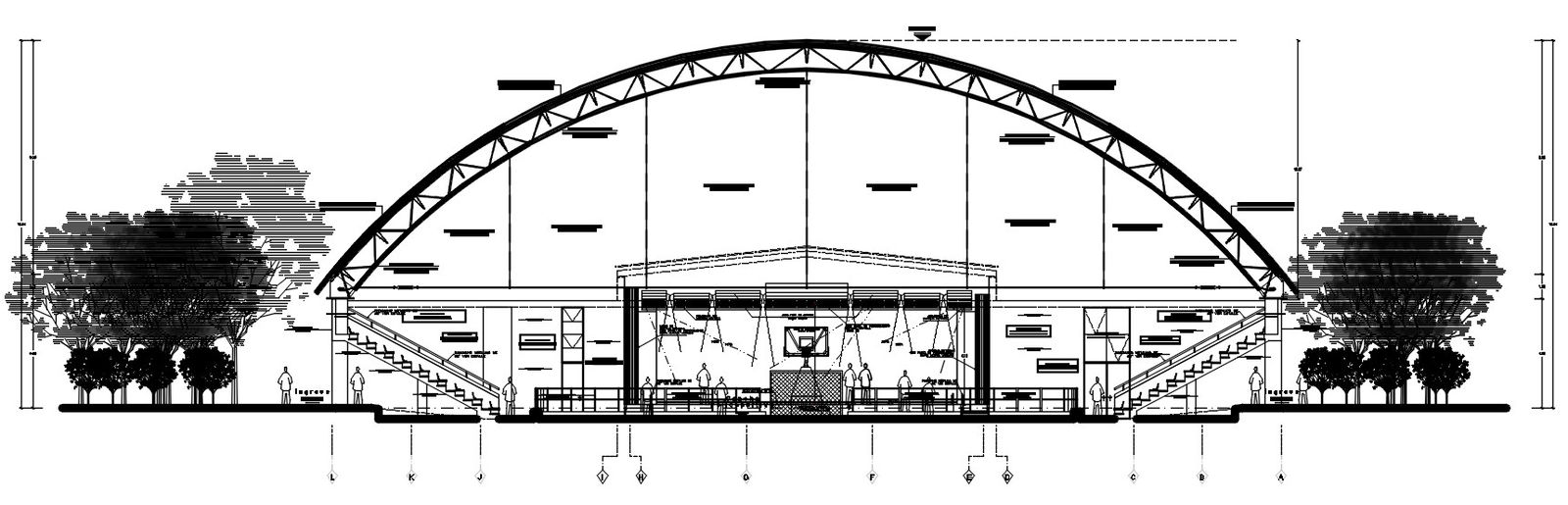 Cross section A-A of the sports stadium design in AutoCAD 2D drawing, CAD file, dwg file