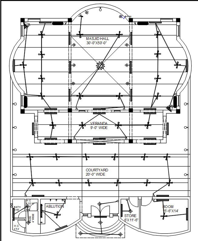 Electric equipment fittings of the mosque plan in AutoCAD 2D drawing. Tubelights, lamps, and fan fittings details are designed in this plan. For more knowledge and detailed information download the 2D AutoCAD dwg file.