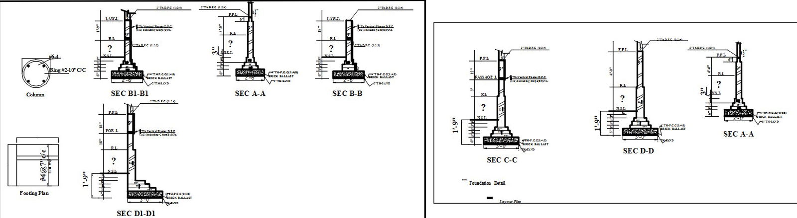 Foundation plan and footing details design in AutoCAD 2D drawing. In this file, Column, sections A-A, B-B, B1-B1, C-C, D-D, and D1-D1 of the foundation details, etc. are given in this file. For more knowledge and detailed information download the 2D AutoCAD dwg file.