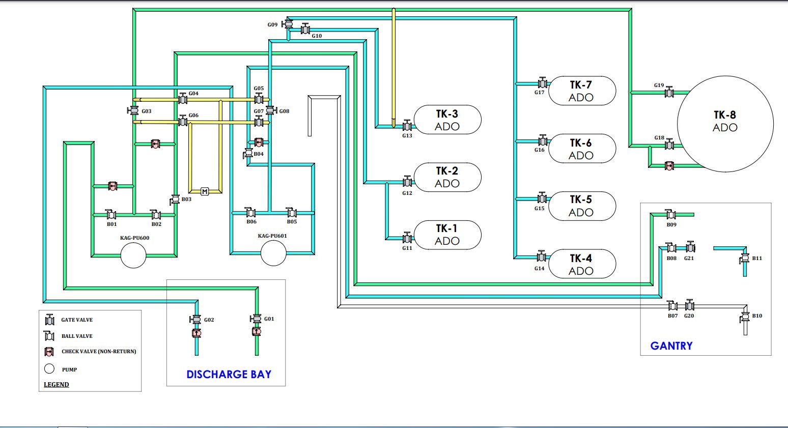 2D design of HAGEN KAGAMUGA TERMINAL - VALVE ALIGNMENT DIAGRAM in AutoCAD. Different valve symbols, pump, discharge bay, gantry, etc. are given in this file. For more knowledge and detailed information download the 2D AutoCAD dwg file.