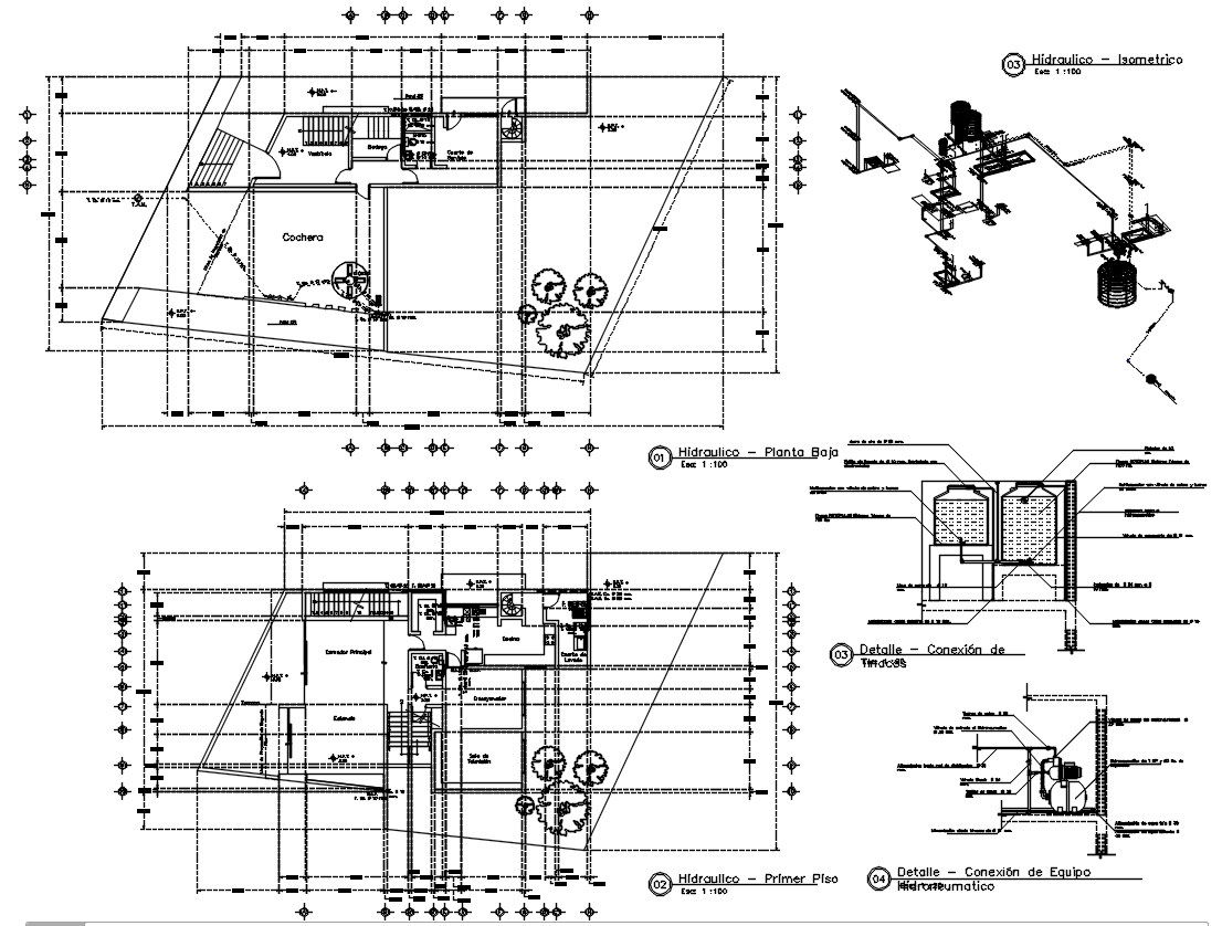 Ground floor and first-floor plan of the hydraulic structure with details in AutoCAD 2D drawing. Detail of the Connection of the water tanks, Detail of the Hydropneumatic Equipment Connection, the Isometric view of the hydraulic structure, and other detailed designs are given in this file. For more knowledge and information download the 2D AutoCAD dwg file.
