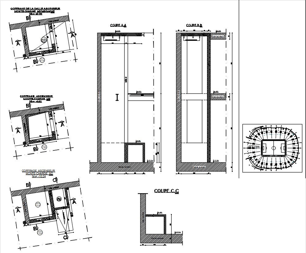 Section detail design of lift formwork in AutoCAD 2D drawing. Coupe A-A, B-B, and C-C of the lift formwork section design are given with details. Niv 0.00, -4.62, and -10.62 sections are given in this file with dimension details. For more knowledge and detailed information download the 2D AutoCAD dwg file.