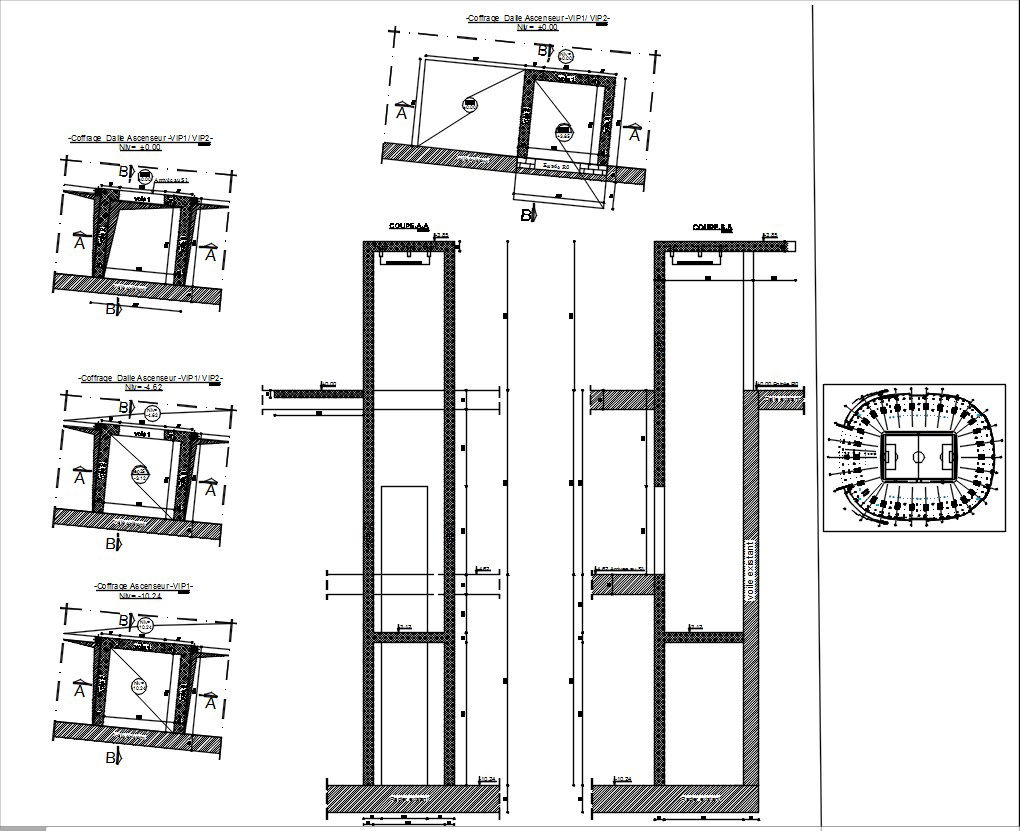 2D design of lift formwork section with details in AutoCAD drawing. Coupe A-A and B-B of the lift formwork section design details are given. Niv 0.00, -4.62, and -10.24 section designs are given in this file. For more knowledge and detailed information download the 2D AutoCAD dwg file.