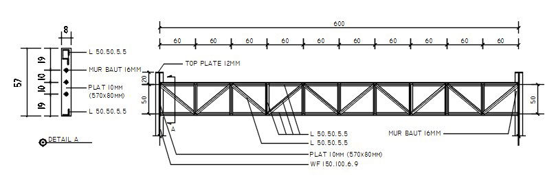 Truss section design in AutoCAD 2D drawing. The length of the truss is 600 given. the top plate size is 12mm and the bottom plate size is 10mm given. The height of the section is 57 given. For more knowledge and detailed information download the 2D AutoCAD dwg file.