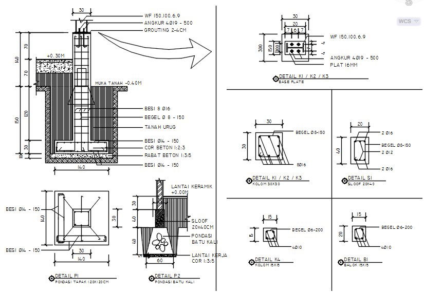 Foundation section and column sections design in AutoCAD 2D drawing, CAD file, dwg file
