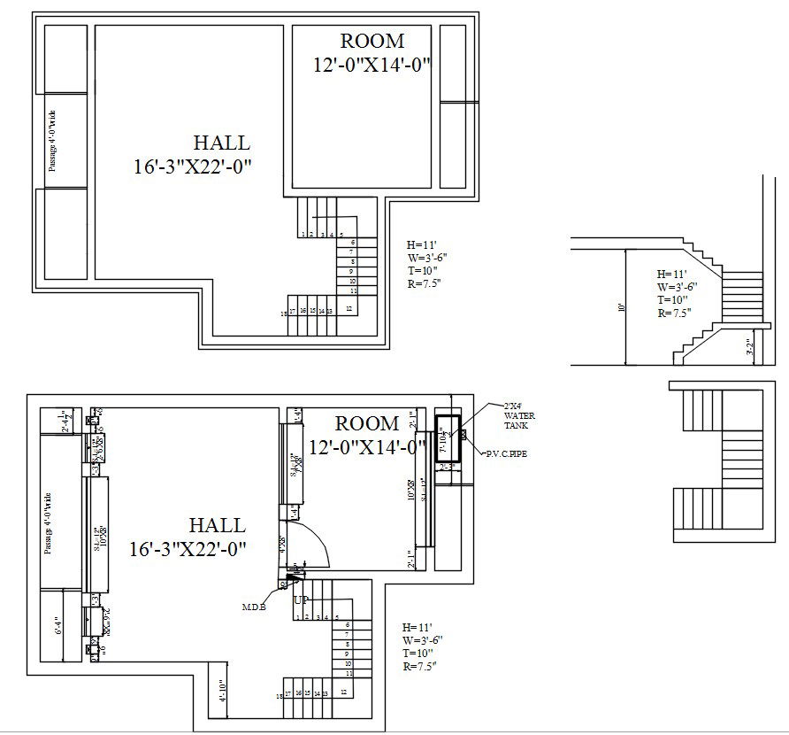 Staircase plan of basement floor design in AutoCAD 2D drawing. 2'x4' water tank, PVC pipe, door-window details, and other information are given in this file. For more knowledge and detailed information download the 2D AutoCAD dwg file.