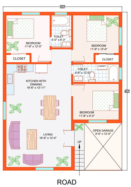 This is a 30 ft X 40 ft house floor plan. It has a 3 bedroom with 2 toilets. this floor plan has a special space provided for the garage area. this floor plan has an open kitchen space with a dining area. there is an open living area accommodation for 6 people. this floor plan has 1 bedroom with an attached toilet and 2 bedrooms without a toilet also there is a common toilet that is accessible to all bedrooms and habitable areas.