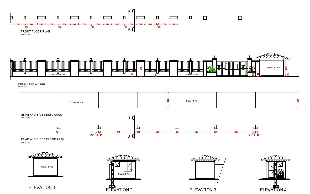 compound wall design dwg includes all construction details, elevations, details drawings, compound wall elevations, and sectional drawings of the compound wall.