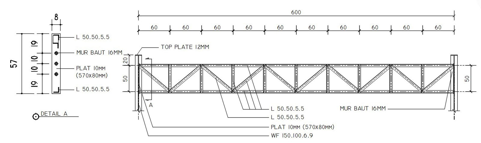 Structural details of the truss design in AutoCAD 2D drawing. L section of 50x50x5x5mm, 16mm dia. bolts, 10mm plate, 150x100x6x9mm sized wooden frame, 12mm top plate, etc. details are available in this design. For more detailed knowledge and information download the 2D AutoCAD file.