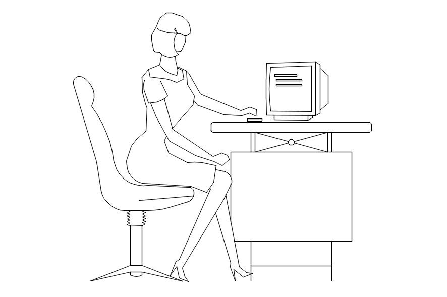 Computer table with seating chair design in AutoCAD 2D drawing. There was a woman seating on the chair is also given. For more knowledge and detailed information download the AutoCAD 2D dwg file.
