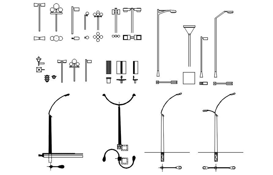 Various types of street lights design CAD blocks in AutoCAD 2D drawing, CAD file, dwg file