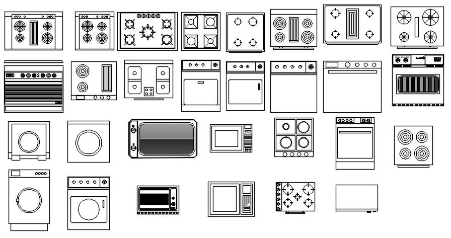 Various types of kitchen equipment design CAD blocks are given in AutoCAD 2D drawing. There were gas, washing machine, dishwasher, microwave oven, refrigerator, and other designs given in this file. For more details and different CAD blocks download the AutoCAD dwg file.