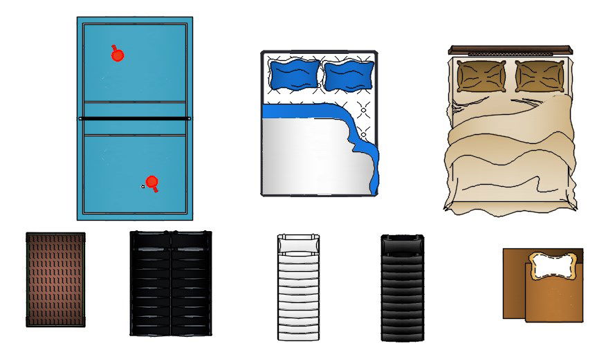 Different furniture and sports club equipment CAD blocks designed in AutoCAD 2D drawing. There were beds, sofa chairs, sunloungers, table tennis, and other blocks designed in this file. For more details and different CAD blocks download the AutoCAD dwg file.
