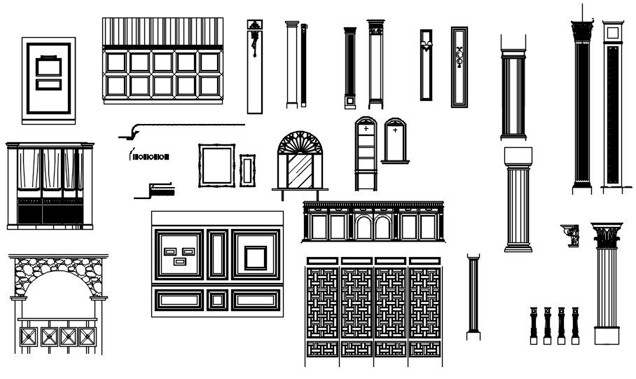 Ornamental Parts of Buildings design CAD blocks in AutoCAD 2D drawing. There were different wall designs, pillars, windows, and other designs given in this file. For more details and different CAD blocks download the AutoCAD dwg file.