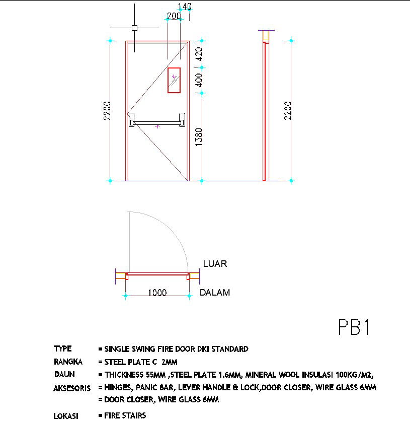 1000×2200 sized single swing fire door design is given in the AutoCAD drawing. A steel plate of 2mm is used. Hinges, panic bar, lever handle, lock, 6mm wire glass, door closer, etc. Accessories are given. It is located at the fire stairs. For more details and information download the AutoCAD drawing file.