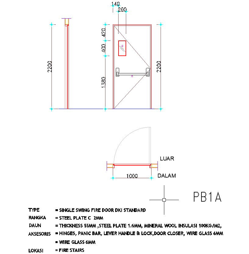 Section and elevation of single swing fire door design are given in AutoCAD drawing. Hinges, panic bar, 6mm wire glass, lever handle and lock, door closer, etc. Accessories are given. The size of the door is 1000×2200 given. For more details and information download the AutoCAD drawing file.