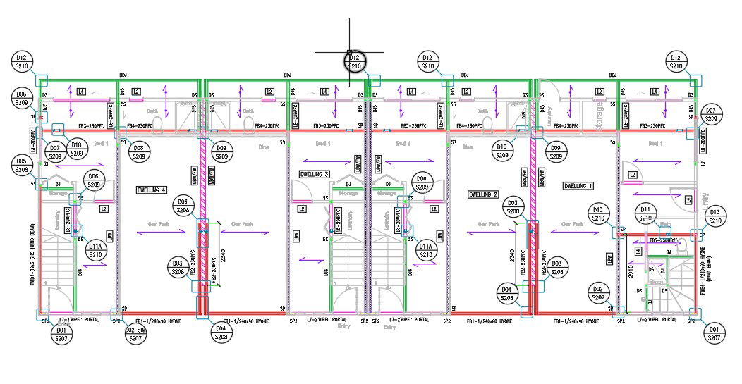 The structural plan of the row house is given in the AutoCAD 2D drawing. The structural design specifies the location, nomenclature, size, and placement of reinforcement, as well as the specifications of structural elements and building load-carrying members. The structural plan is critical since it focuses on the structure's strength. For more knowledge and detailed information download the AutoCAD 2D dwg file.