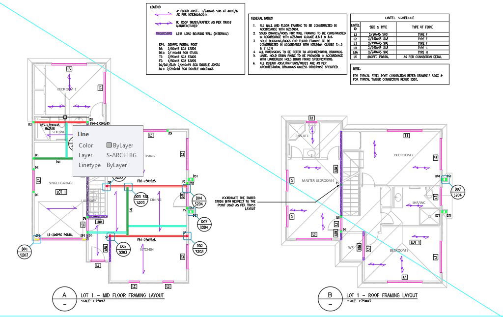 Lot 1 mid-floor and roof framing layout plan designs are given in the AutoCAD 2D drawing. Different structural details are specified in this design. For more knowledge and detailed information download the AutoCAD 2D dwg file.