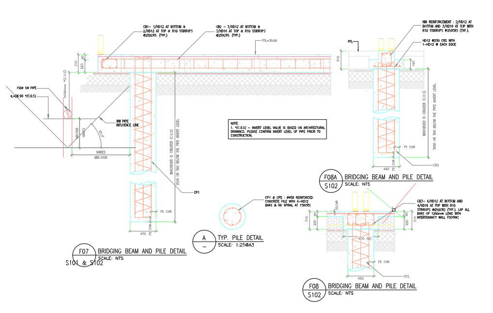 AutoCAD 2D design of different structure sections. There were typical pile detail, typical beam detail, bridging beam and pile detail, etc. designs given. For more knowledge and detailed information download the AutoCAD 2D dwg file.