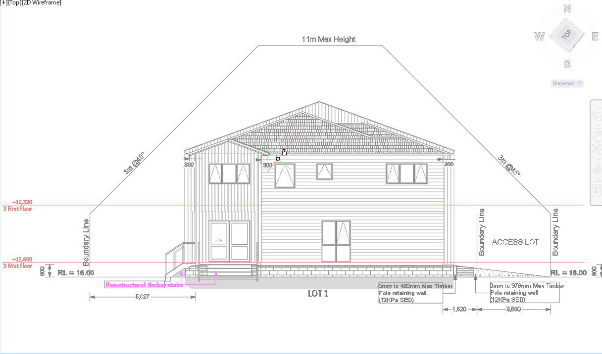 The front elevation of lot 1 of the row house design is given in the AutoCAD 2D drawing. The maximum height of the house is 11m specified. stair details are also given. For more knowledge and detailed information download the AutoCAD 2D dwg file.
