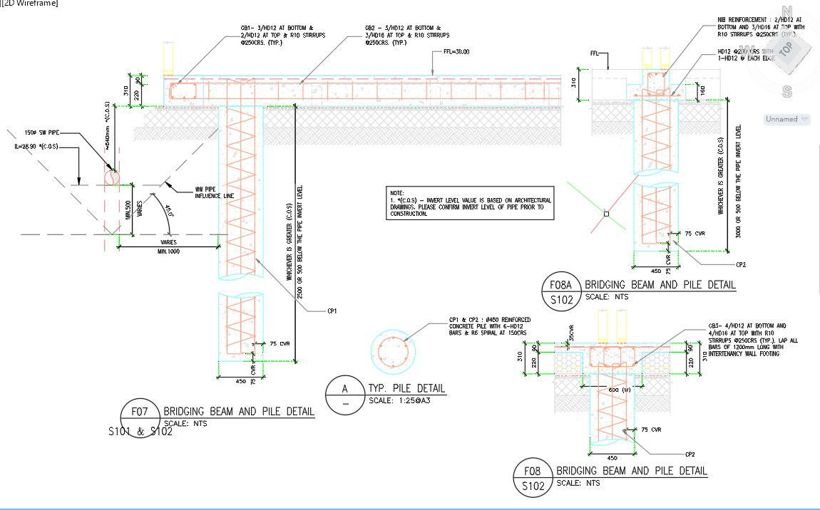 Bridging beam and pile detail sections are designed in AutoCAD 2D drawing. Reinforcement details are specified in this design. For more knowledge and detailed information download the AutoCAD 2D dwg file.