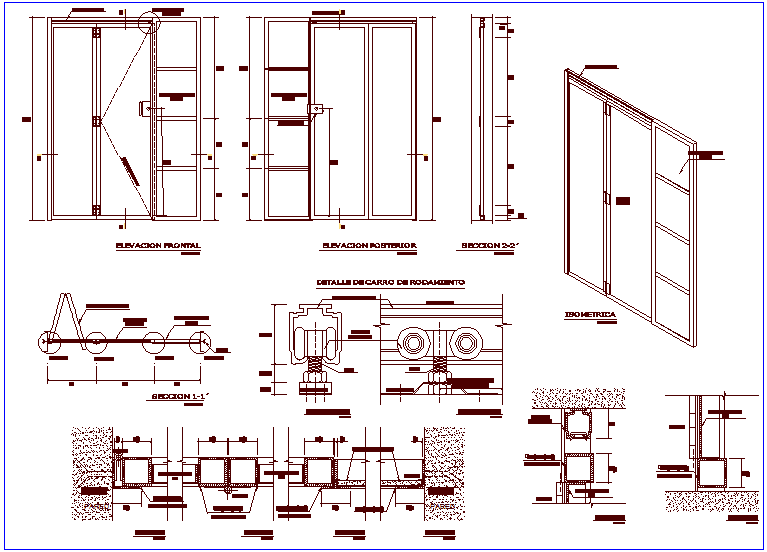 dimension and hinge,handle and frame view of door bearing cart view with sectional detail and isometric view of door.