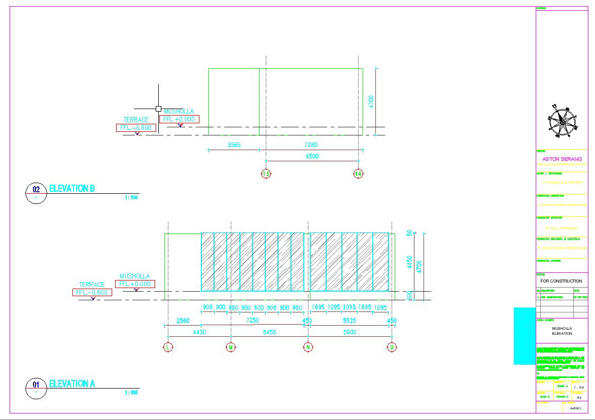 Elevation A and elevation B design of the musholla in AutoCAD 2D drawing. dimension details are specified in the designs. For more knowledge and detailed information download the AutoCAD 2D dwg file.