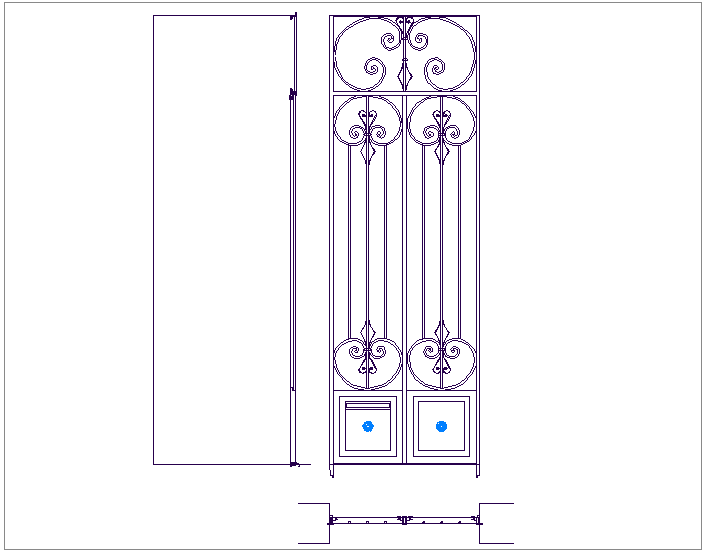 Decorative wrought iron door design dwg file with view of door and door flower shape