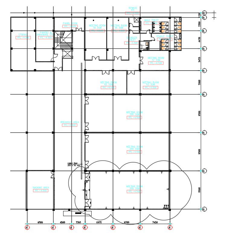 The First Floor Plan Of The Meeting Room Is Given In AutoCAD 2D Drawing. There Was a Meeting Room, Meeting Room Terrace, Storage area, Panel Room, Pantry & Chinawar Store, Sewage Pit, Male Toilet, Female Toilet, Disabled Toilet, Smoking Area & Other Details Given On This Floor. For More Knowledge and Detailed Information Download The AutoCAD 2D Drawing File.