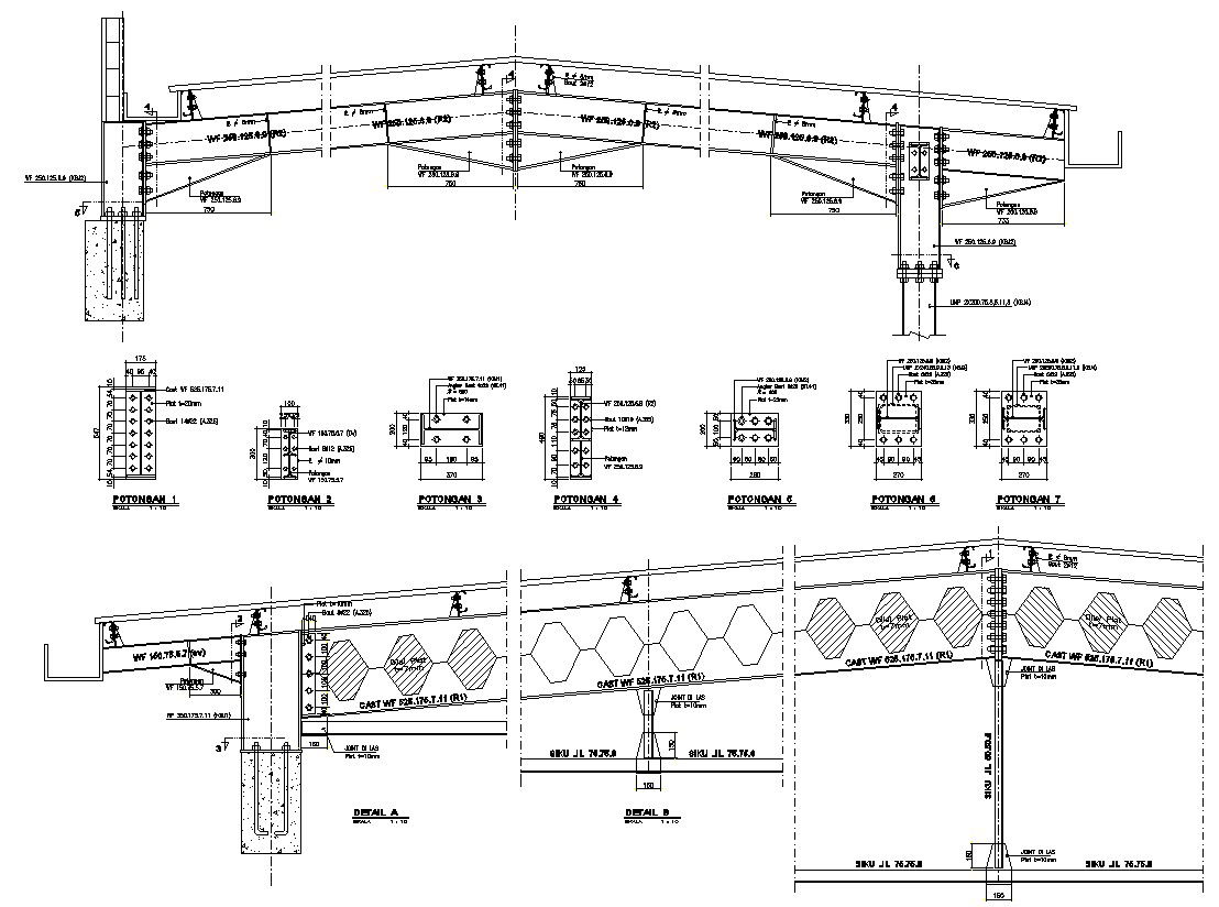 Detailed designs of steel roof connections are given in the AutoCAD 2D drawing. There were sections 1-7, and detail A, B & C of the steel roof connections are designed in this file. For more knowledge and detailed information download the AutoCAD 2D dwg file.