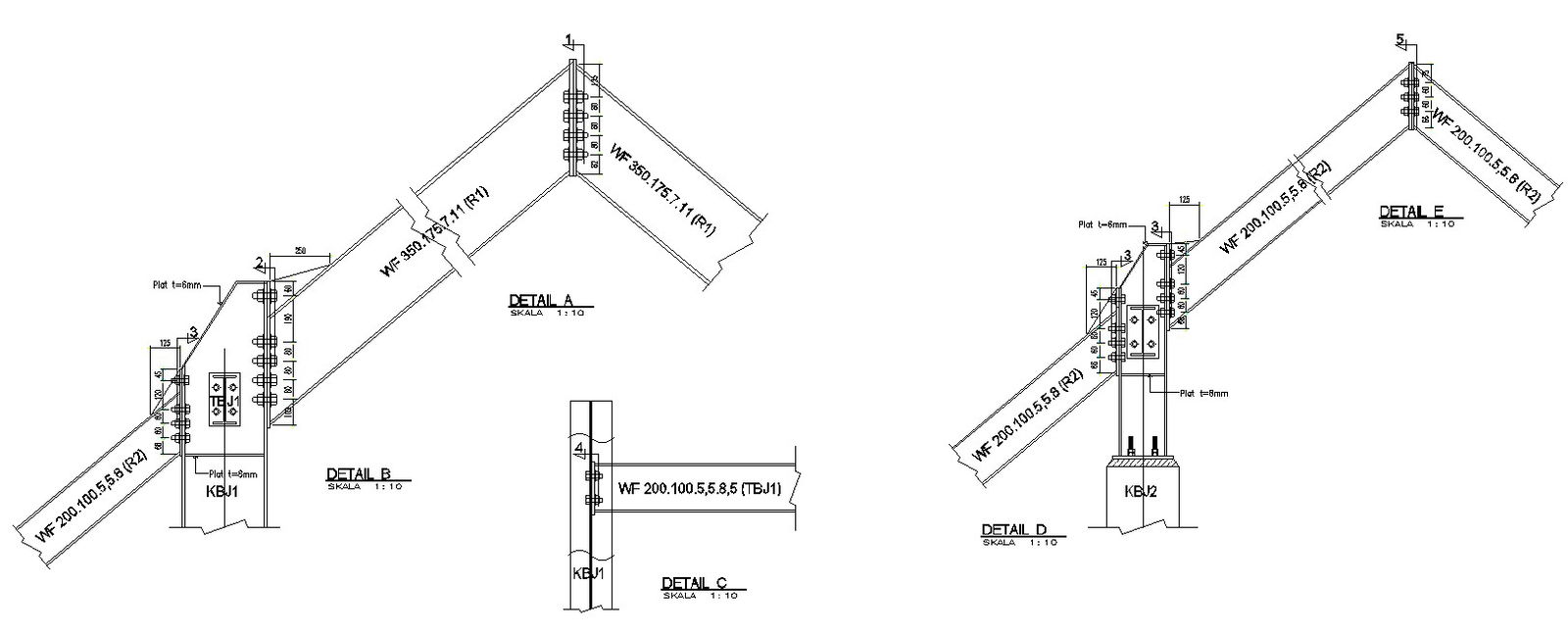 Details of the roof connection design are given in the AutoCAD 2D drawing. Sections 1 to 5 and details A to E of the roof connections detail design are presented in this file. For more knowledge and detailed information download the AutoCAD 2D dwg file.