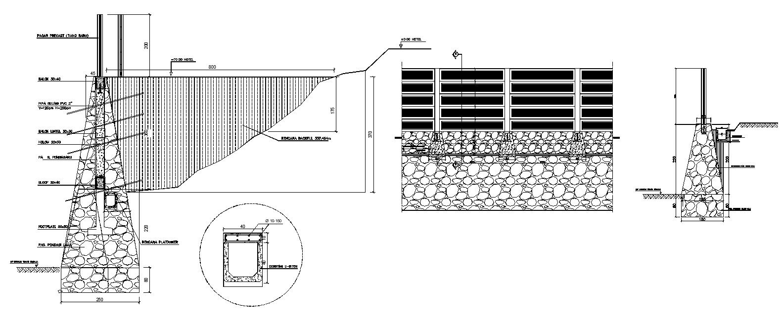 Gravity base Structure for Stone Foundation details in AutoCAD 2D drawing, CAD file, dwg file. Stones make up the foundation, as one might expect, and mortar is used to bind the stones together to form the walls that support the house & Gravity retaining walls are those that withstand lateral ground forces by using their own weight as support. For more detailed information download the 2D AutoCAD dwg file.