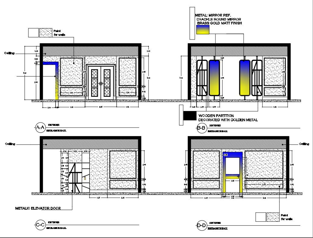 Ground Floor Plan In The Entrance Hall And Section Plan Autocad 2D Drawing, Dwg File Section Plan Dwg File. Ground Floor Plan In The Entrance Hall That Includes A Front Section, Metal Elevator Door, Crackle Round Mirror, Wooden Partition, Decorated With Golden Metal, Windows, Ceiling View, And Much More Of House Design. For More Knowledge and Detailed Information Download The AutoCAD 2D DWG File.