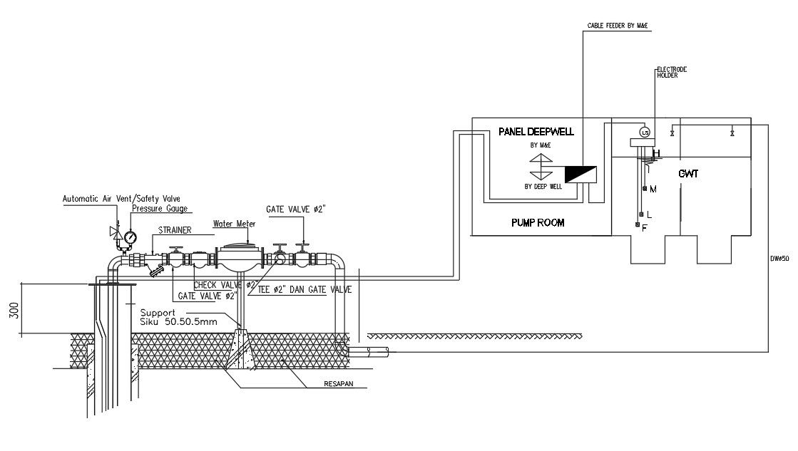 Pump Room is Given in AutoCAD 2D Drawing, dwg file, and cad file. details that include Cable Feeder By MME, eLECTRODE, Holder, Panel, Deepwell Automatic Air Vent valve, Pressure Gauge, Gate Valve, Strainer Water Meter, Check Valve, and DAN Gate Valve. For more detailed knowledge and information download the 2D AutoCAD file.