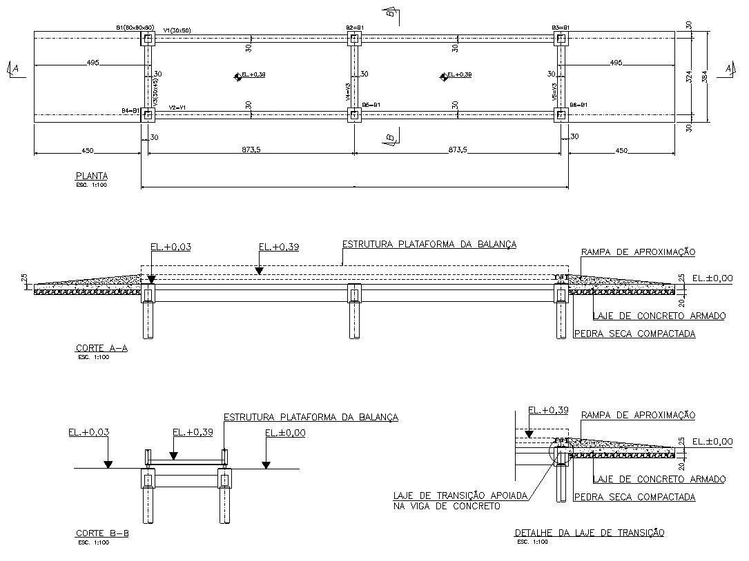 This structural drawing is a DETAIL OF THE TRANSITION SLAB design given in AutoCAD 2D drawing. To compensate for the heavier vibrations at the bridge ends, a transition slab is employed, preventing the development of transverse bumps and dips and pavement cracking. This file contains the plan, cross sections A-A, B-B, and other designs. For more knowledge and detailed information download the AutoCAD 2D dwg file.