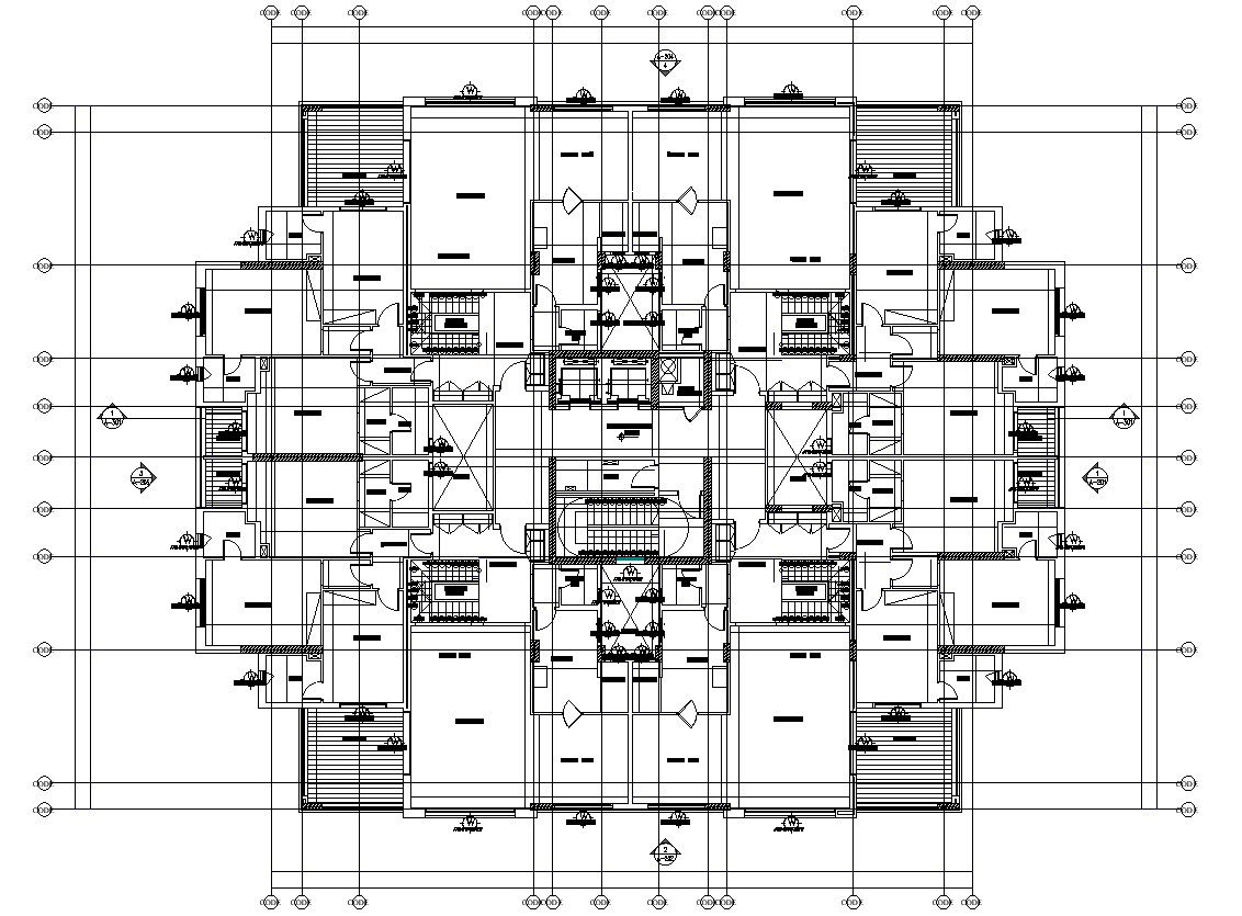 A typical floor plan for a four-Unit apartment building details is given in this Autocad 2D file. This file consists of a furniture layout drawing with services, and utilities detail drawing given with dimensions and specifications. For more detailed knowledge and information download the 2D AutoCAD file.