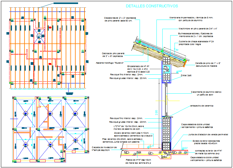 of wooden structure view with necessary dimension and wooden column view in Wooden structure view of sheet metal roof.