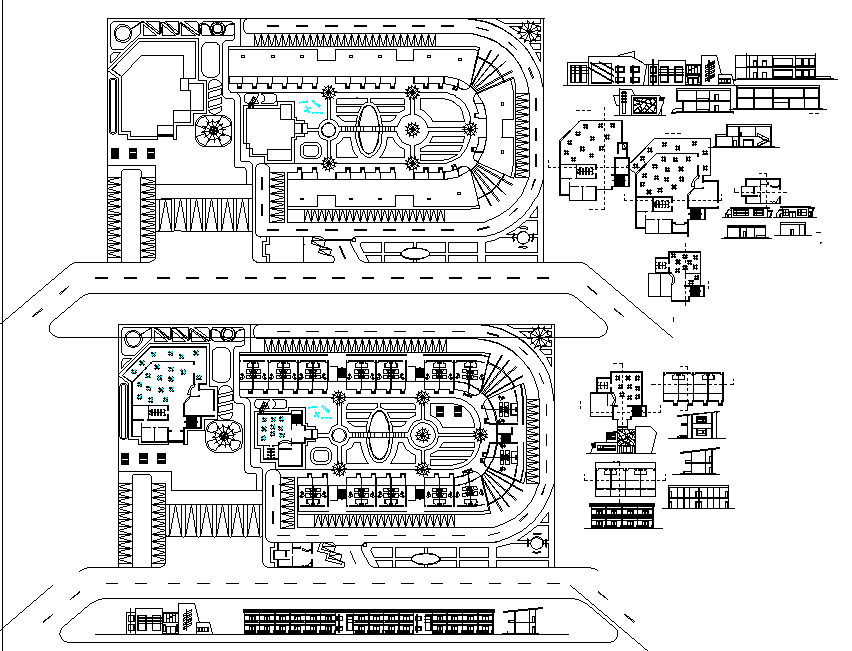 Layout plan of motel project include restaurant, Rest rooms, dinning area, elevation view of door and balcony, circular view of entrance.
