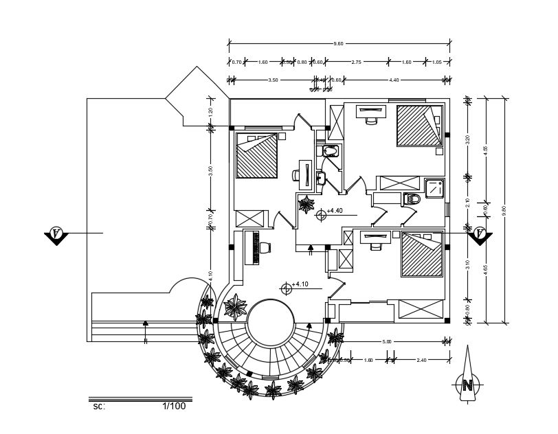 10x9m 5 bedroom villa house plan cad drawing is given in this file. This is a 2d cad drawing house plan which is consists of the passage, master bedroom with an attached toilet, kid’s room, guest room, and two common bathrooms are available. Each room is designed with a computer table. This house is most suitable for joint nuclear family.