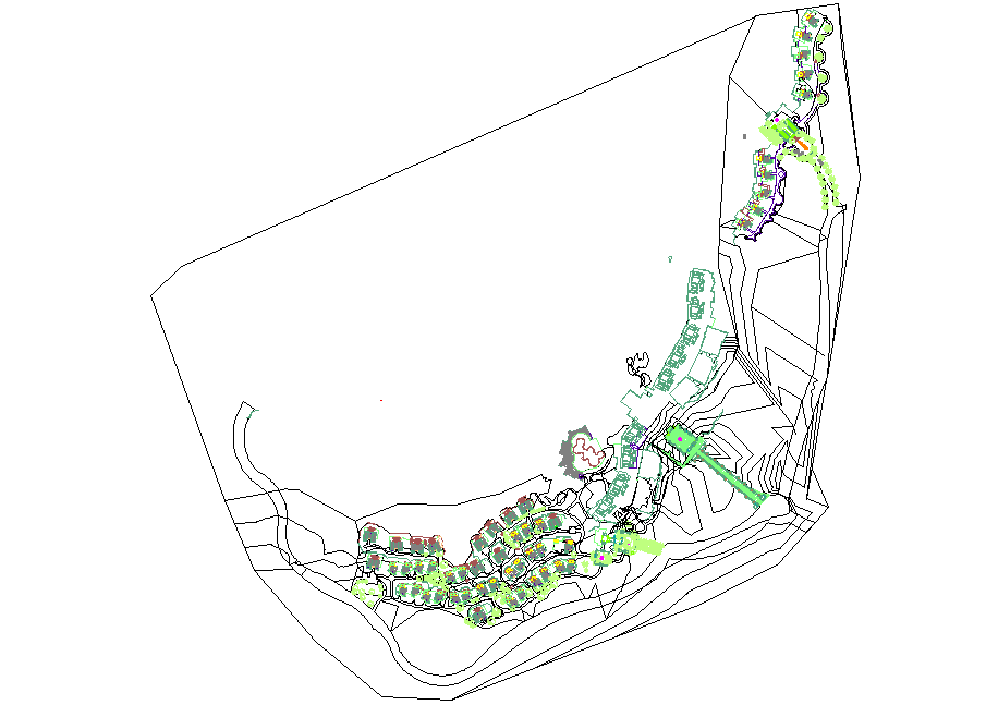 Town Planning dwg file. Town’s zonal planning, geographical location, aerial view of vegetation and irrigation resources, architectural layout, construction plans.
