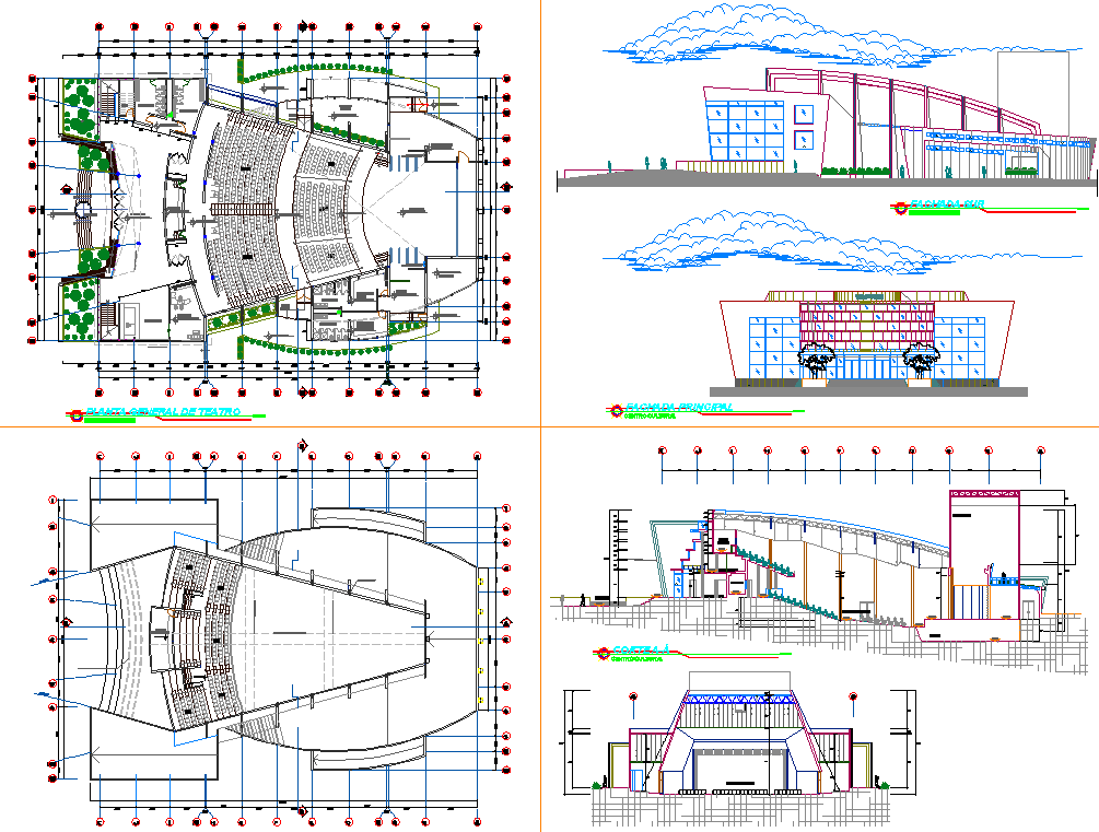 This multiplex theater CAD drawing provides a complete set of architectural details suitable for planning and execution. The file includes all floor plans with seating layout, distribution lobby spaces service areas and circulation paths. The sectional views clearly display height levels, structural arrangement, and internal layout proportions. The elevation drawings illustrate exterior facade treatment material arrangement and overall design style. These drawings support precise measurement reference and help in visualizing both internal and external spatial arrangements.