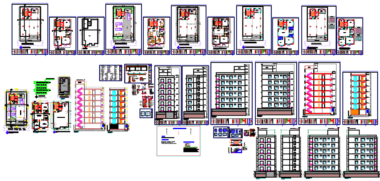 Section Elevation and Floor Layout Plan Details for High Rise Residential Building In DWG File