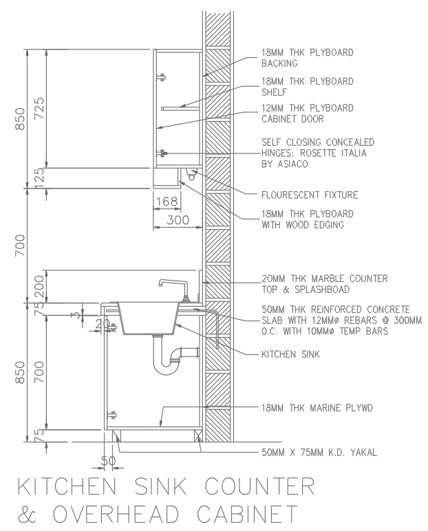 Explore the intricate details of a kitchen setup with this user-friendly AutoCAD file, showcasing a sectional view of the kitchen sink and a meticulously designed overhead cabinet. The drawing includes specifications such as 18mm thick plyboard backing and shelves, a 20mm thick marble countertop with splashboard, and sturdy 18mm thick marine plywood. Dive into the CAD drawing to grasp the layout, dimensions, and placement of essential elements like the kitchen sink, offering a comprehensive view of the functional and aesthetic aspects. This DWG file provides a valuable resource for architects, designers, and enthusiasts seeking a clear and detailed representation of a well-equipped kitchen space.
